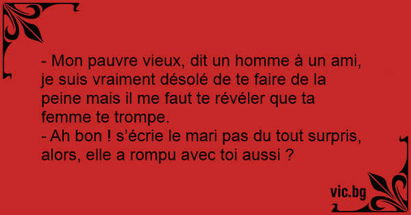 - Mon pauvre vieux, dit un homme à un ami, je suis vraiment désolé de te faire de la peine mais il me faut te révéler que ta femme te trompe.