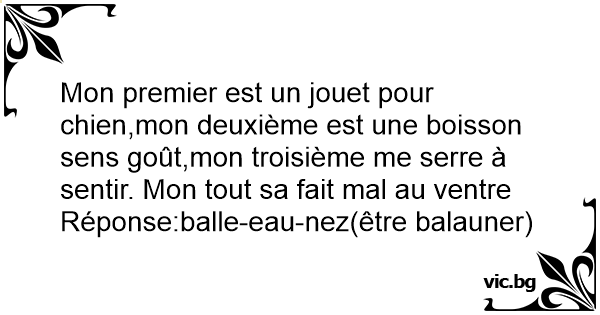 Mon premier est un jouet pour chien,mon deuxième est une boisson sens goût,mon troisième me serre à sentir. Mon tout sa fait mal au ventre