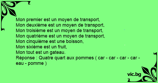 Réponse : Quatre quart aux pommes ( car - car - car - car - eau - pomme )
