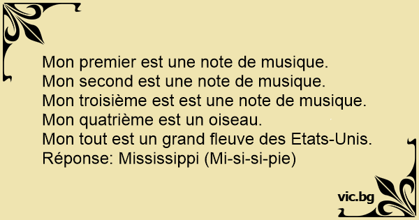 Mon premier est une note de musique.<br />Mon second est une note de musique.<br />Mon troisième est est une note de musique.<br />Mon quatrième est un oiseau.<br />Mon tout est un grand fleuve des Etats-Unis.<br />Réponse: Mississippi (Mi-si-si-pie)