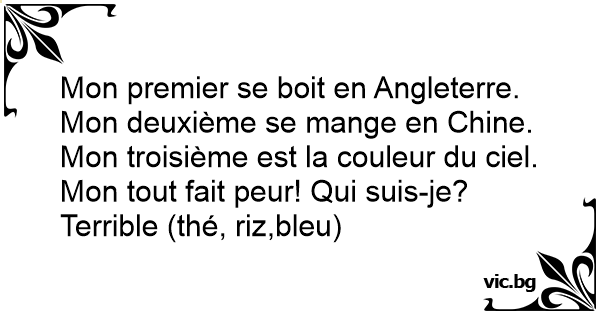 Mon premier se boit en Angleterre. Mon deuxième se mange en Chine. Mon troisième est la couleur du ciel. Mon tout fait peur! Qui suis-je?