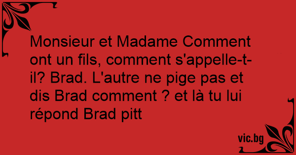 Monsieur et Madame Comment ont un fils, comment s'appelle-t-il? Brad. L'autre ne pige pas et dis Brad comment ? et là tu lui répond Brad pitt