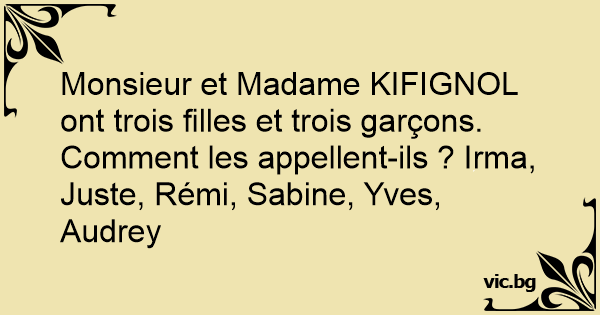 Monsieur et Madame KIFIGNOL ont trois filles et trois garçons. Comment les appellent-ils ? Irma, Juste, Rémi, Sabine, Yves, Audrey
