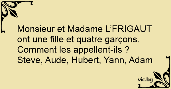 Monsieur et Madame L’FRIGAUT ont une fille et quatre garçons. Comment les appellent-ils ? Steve, Aude, Hubert, Yann, Adam