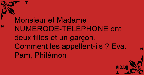 Monsieur et Madame NUMÉRODE-TÉLÉPHONE ont deux filles et un garçon. Comment les appellent-ils ? Éva, Pam, Philémon