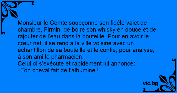 Monsieur le Comte soupçonne son fidèle valet de chambre, Firmin, de boire son whisky en douce et de rajouter de l’eau dans la bouteille. Pour en avoir le cœur net, il se rend à la ville voisine avec un échantillon de sa bouteille et le confie, pour analyse, à son ami le pharmacien.