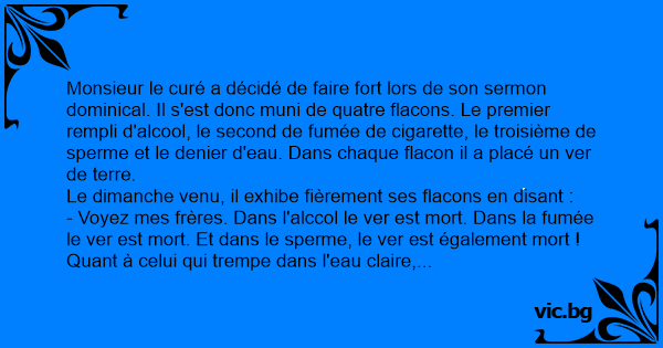 Monsieur le curé a décidé de faire fort lors de son sermon dominical. Il s'est donc muni de quatre flacons. Le premier rempli d'alcool, le second de fumée de cigarette, le troisième de sperme et le denier d'eau. Dans chaque flacon il a placé un ver de terre.