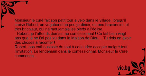 - Robert, je t’attends demain au confessionnal ! Ca fait bien vingt ans que je ne t’ai pas vu dans la Maison de Dieu… Tu dois en avoir des choses à raconter !