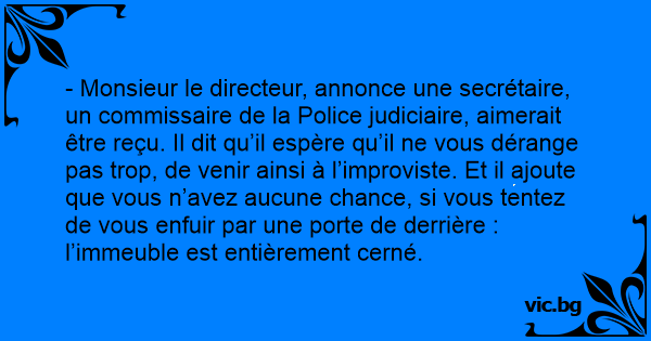 - Monsieur le directeur, annonce une secrétaire, un commissaire de la Police judiciaire, aimerait être reçu. Il dit qu’il espère qu’il ne vous dérange pas trop, de venir ainsi à l’improviste. Et il ajoute que vous n’avez aucune chance, si vous tentez de vous enfuir par une porte de derrière : l’immeuble est entièrement cerné.