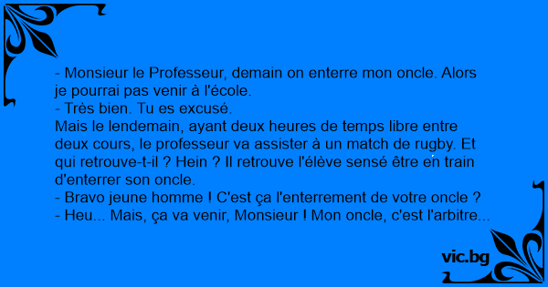 Mais le lendemain, ayant deux heures de temps libre entre deux cours, le professeur va assister à un match de rugby. Et qui retrouve-t-il ? Hein ? Il retrouve l'élève sensé être en train d'enterrer son oncle.
