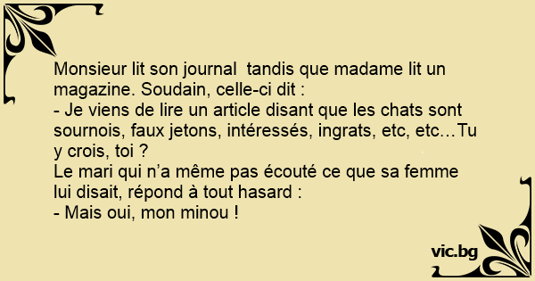 Monsieur lit son journal tandis que madame lit un magazine. Soudain, celle-ci dit :