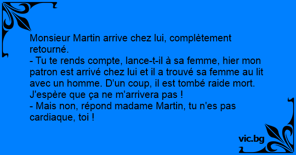 - Tu te rends compte, lance-t-il à sa femme, hier mon patron est arrivé chez lui et il a trouvé sa femme au lit avec un homme. D'un coup, il est tombé raide mort. J'espère que ça ne m'arrivera pas !