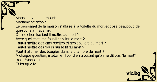 À chaque question, madame répond en ajoutant qu'on ne dit pas "le mort", mais "Monsieur".