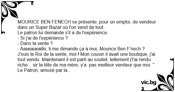 - Aaiaiaiaiaille, ti me dimande ça à moi, Mourice Ben F'nech ? J'suis le Roi de la vente, moi ! Mon cousin il avait une boutique, j'ai tout vendu. Maintenant il est parti au souleil, tellement j'l'ai rendu riche... sir la tête de ma mère, y'a pas meilleur vendeur que moi. "