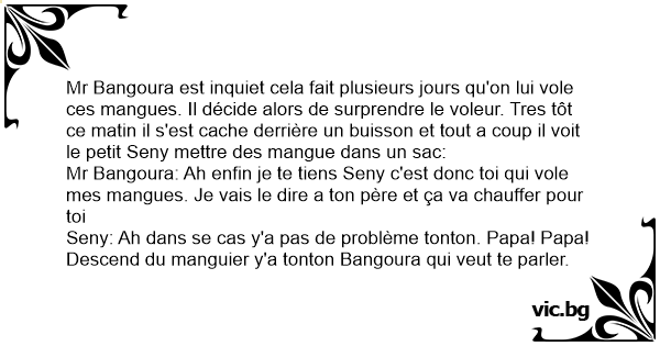 Mr Bangoura est inquiet cela fait plusieurs jours qu'on lui vole ces mangues. Il décide alors de surprendre le voleur. Tres tôt ce matin il s'est cache derrière un buisson et tout a coup il voit le petit Seny mettre des mangue dans un sac: