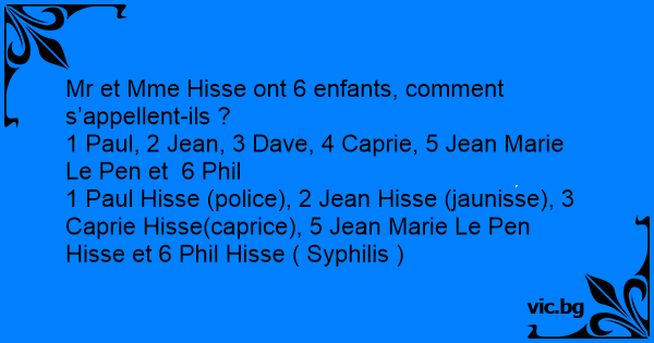 1 Paul Hisse (police), 2 Jean Hisse (jaunisse), 3 Caprie Hisse(caprice), 5 Jean Marie Le Pen Hisse et 6 Phil Hisse ( Syphilis )