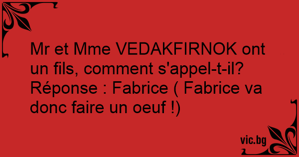 Mr et Mme VEDAKFIRNOK ont un fils, comment s'appel-t-il? Réponse : Fabrice ( Fabrice va donc faire un oeuf !)