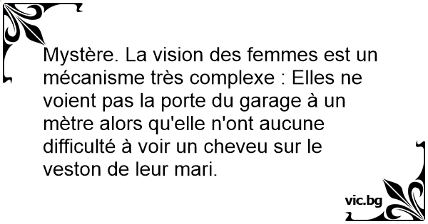 Mystère. La vision des femmes est un mécanisme très complexe : Elles ne voient pas la porte du garage à un mètre alors qu'elle n'ont aucune difficulté à voir un cheveu sur le veston de leur mari.