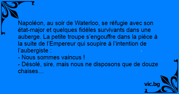 Napoléon, au soir de Waterloo, se réfugie avec son état-major et quelques fidèles survivants dans une auberge. La petite troupe s’engouffre dans la pièce à la suite de l’Empereur qui soupire à l’intention de l’aubergiste :