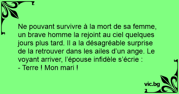 Ne pouvant survivre à la mort de sa femme, un brave homme la rejoint au ciel quelques jours plus таrd. Il a la désagréable surprise de la retrouver dans les ailes d’un ange. Le voyant arriver, l’épouse infidèle s’écrie :