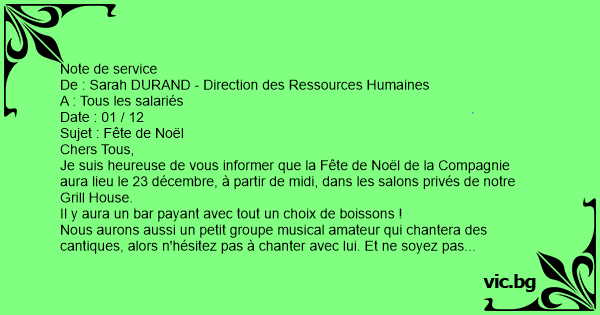 Je suis heureuse de vous informer que la Fête de Noël de la Compagnie aura lieu le 23 décembre, à partir de midi, dans les salons privés de notre Grill House.