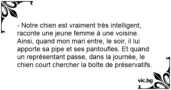 - Notre chien est vraiment très intelligent, raconte une jeune femme à une voisine. Ainsi, quand mon mari entre, le soir, il lui apporte sa pipe et ses pantoufles. Et quand un représentant passe, dans la journée, le chien court chercher la boîte de préservatifs.