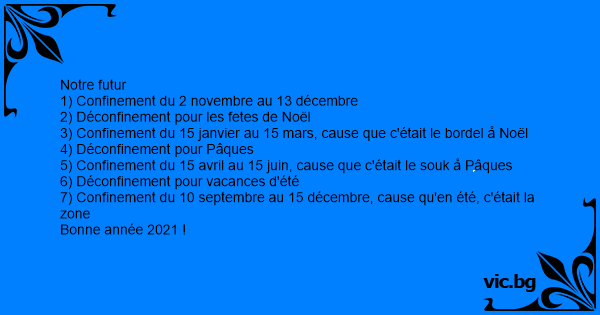 3) Confinement du 15 janvier au 15 mars, cause que c'était le bordel å Noël