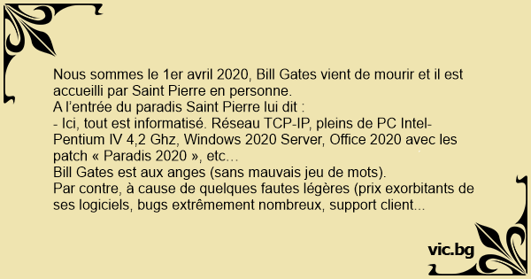 Un siècle plus таrd (donc le 1er avril 2120), Bill Gates arrive en se traînant péniblement jusqu’à la porte du Paradis. Sаinт Pierre l’accueille :