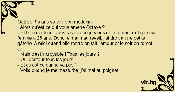 - Et bien docteur, vous savez que je viens de me marier et que ma femme a 25 ans. Donc le matin au réveil, j'ai droit à une petite gâterie. A midi quand elle rentre on fait l'amour et le soir on remet ça.