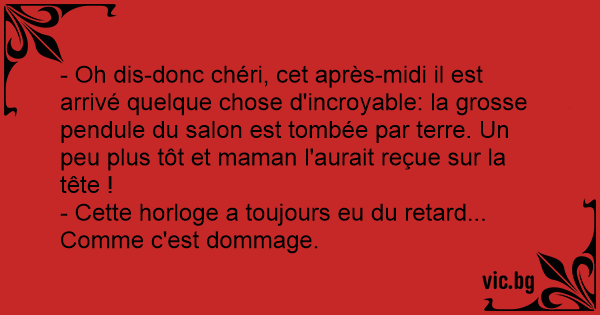 - Oh dis-donc chéri, cet après-midi il est arrivé quelque chose d'incroyable: la grosse pendule du salon est tombée par terre. Un peu plus tôt et maman l'aurait reçue sur la tête !
