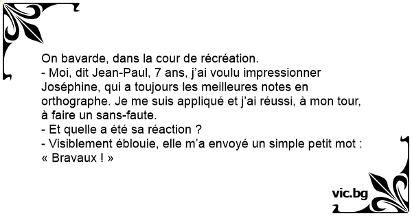 - Moi, dit Jean-Paul, 7 ans, j’ai voulu impressionner Joséphine, qui a toujours les meilleures notes en orthographe. Je me suis appliqué et j’ai réussi, à mon tour, à faire un sans-faute.