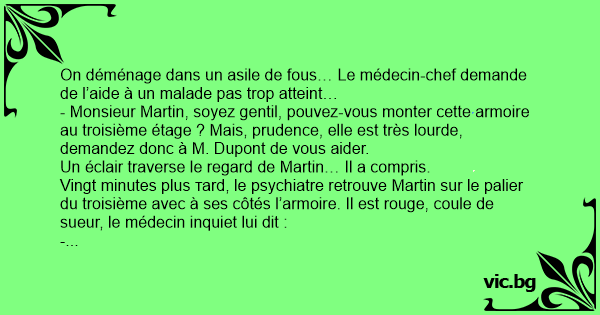 Vingt minutes plus таrd, le psychiatre retrouve Martin sur le palier du troisième avec à ses côtés l’armoire. Il est rouge, coule de sueur, le médecin inquiet lui dit :