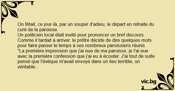 Un politicien local était invité pour prononcer un bref discours. Comme il tardait à arriver, le prêtre décide de dire quelques mots pour faire passer le temps à ses nombreux paroissiens réunis.