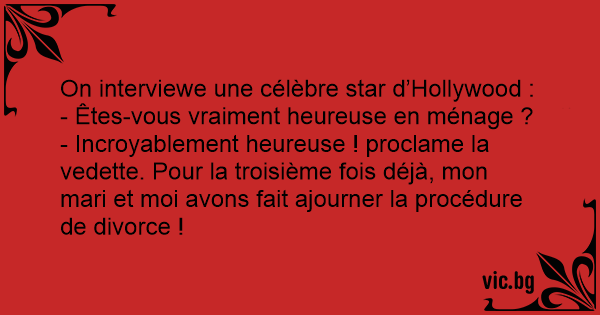 - Incroyablement heureuse ! proclame la vedette. Pour la troisième fois déjà, mon mari et moi avons fait ajourner la procédure de divorce !