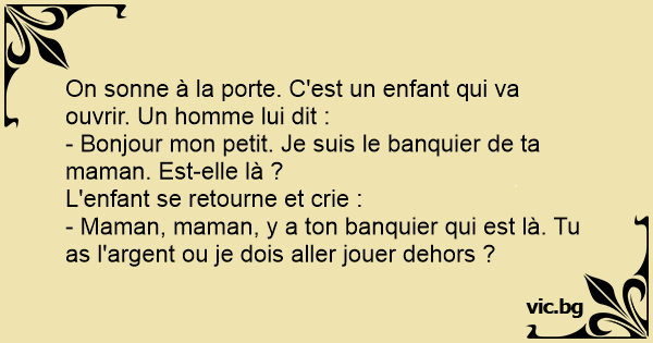 - Maman, maman, y a ton banquier qui est là. Tu as l'argent ou je dois aller jouer dehors ?