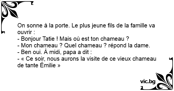 - « Ce soir, nous aurons la visite de ce vieux chameau de tante Émilie »
