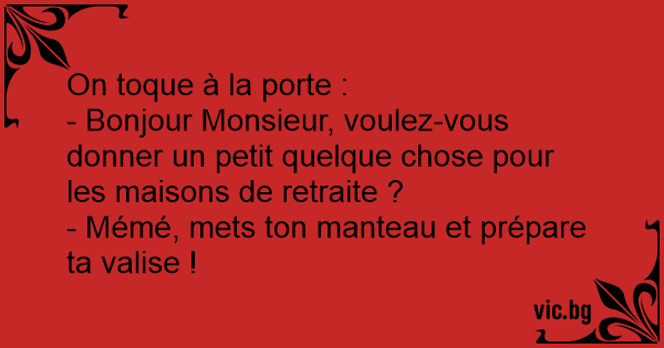 Det ringer på dörren. - Hej, jag har en insamling till ett äldreboende. - Vänta lite, du kan få min svärmor med detsamma