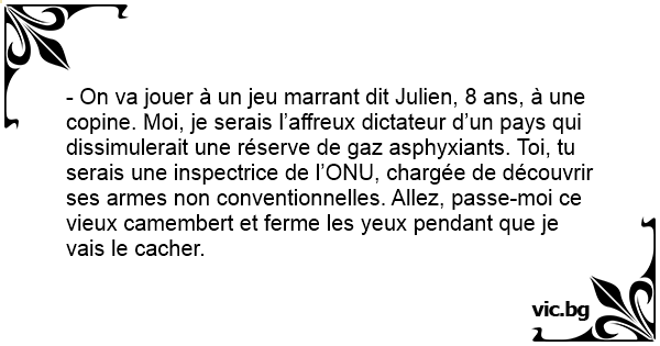 - On va jouer à un jeu marrant dit Julien, 8 ans, à une copine. Moi, je serais l’affreux dictateur d’un pays qui dissimulerait une réserve de gaz asphyxiants. Toi, tu serais une inspectrice de l’ONU, chargée de découvrir ses armes non conventionnelles. Allez, passe-moi ce vieux camembert et ferme les yeux pendant que je vais le cacher.