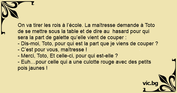 On va tirer les rois à l’école. La maîtresse demande à Toto de se mettre sous la table et de dire au  hasard pour qui sera la part de galette qu’elle vient de couper :