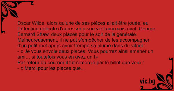 Oscar Wilde, alors qu’une de ses pièces allait être jouée, eu l’attention délicate d’adresser à son vieil ami mais rival, George Bernard Shaw, deux places pour le soir de la générale. Malheureusement, il ne put s’empêcher de les accompagner d’un petit mot après avoir trempé sa plume dans du vitriol :