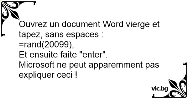 Ouvrez un document Word vierge et tapez, sans espaces :<br />=rand(20099),<br />Et ensuite faite "enter".<br />Microsoft ne peut apparemment pas expliquer ceci !