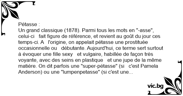 Un grand classique (1878). Parmi tous les mots en "-asse", celui-ci fait figure de référence, et revient au goût du jour ces temps-ci. A l'origine, on appelait pétasse une prostituée occasionnelle ou débutante. Aujourd'hui, ce terme sert surtout à évoquer une fille sеxy et vulgaire, habillée de façon très voyante, avec des seins en plastique et une jupe de la même matière. On dit parfois une "super-pétasse" (si c'est Pamela Anderson) ou une "lumpenpetasse" (si c'est une des Spice Girls), ou encore une "tassepe" (si c'est Loubry Veronika). Attention : A partir d'une certaine heure, il peut s'agir d'un compliment.
