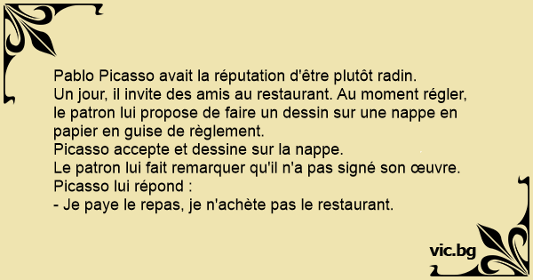 Un jour, il invite des amis au restaurant. Au moment régler, le patron lui propose de faire un dessin sur une nappe en papier en guise de règlement.