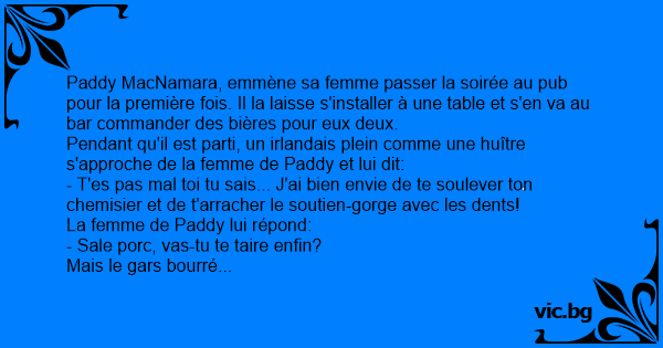 Pendant qu'il est parti, un irlandais plein comme une huître s'approche de la femme de Раddy et lui dit: