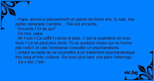 - Papa, annonce piteusement un gamin de treize ans, tu sais, ma petite camarade Caroline… Elle est enceinte.