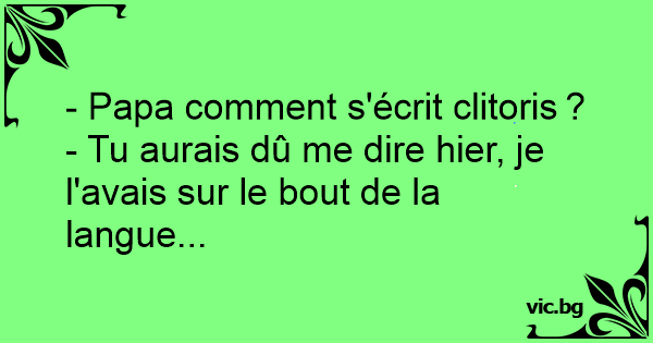 Toto demande à son père : - Dis papa, comment ça s’écrit « clitoris » ? - Et bien ,c’est une question que tu aurais dû me poser hier soir, je l’avais sur le bout de la langue…