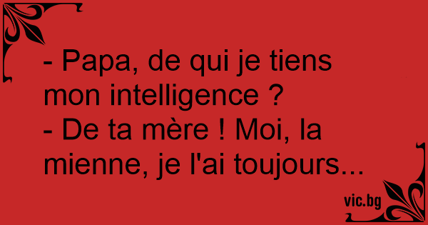 Le petit gars demande a son père : - Papa, quand je suis venu au monde, qui m'a donné mon intelligence ? - C'est sûrement ta mère répond le père, car moi j'ai encore la mienne.