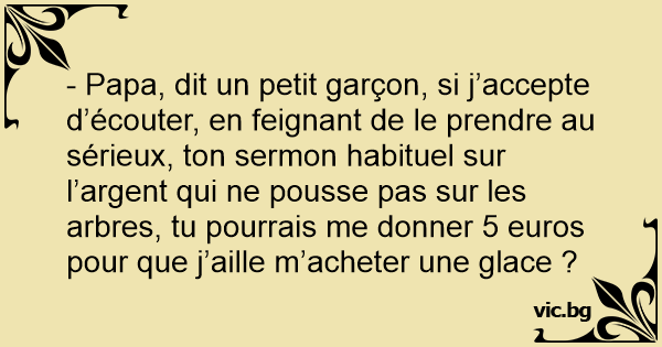 - Papa, dit un petit garçon, si j’accepte d’écouter, en feignant de le prendre au sérieux, ton sermon habituel sur l’argent qui ne pousse pas sur les arbres, tu pourrais me donner 5 euros pour que j’aille m’acheter une glace ?