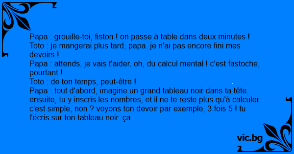 Papa : tout d'abord, imagine un grand tableau noir dans ta tête. ensuite, tu y inscris les nombres, et il ne te reste plus qu'à calculer. c'est simple, non ? voyons ton devoir par exemple, 3 fois 5 ! tu l'écris sur ton tableau noir. ça y est, ton calcul est écrit ? alors, toto, c'est fait ?