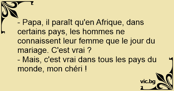 - C'est vrai papa, que dans certaine parties de l'Afrique, un homme ne connait pas sa femme avant de se marier ? Le Père: - Et c'est pareil dans tous les pays...